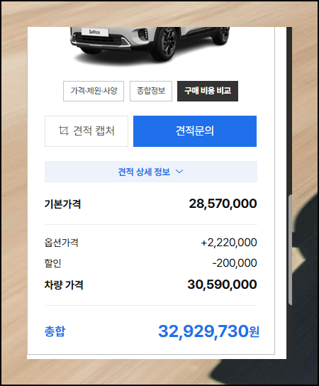 무료 회원가입 없이도 바로 이용 가능하며, 각종 세금과 부대비용까지 포함된 신차 가격표 및 총액을 볼 수 있어서 예산 계획 세우기에 정말 유용해요. 기아자동차의 인기 소형 suv에 해당하는 셀토스 구매를 고려 중이시라면 꼭 한 번 확인해보세요.