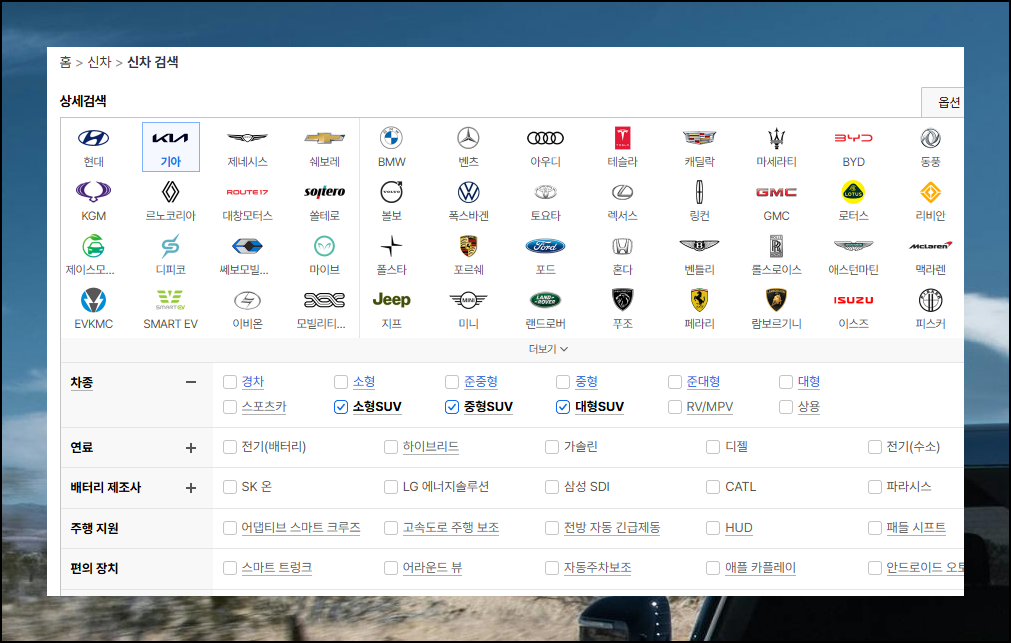 소형 suv 분류에서 셀토스를 찾을 수 있어요. 연료 종류나 편의 장치 같은 조건으로 필터 검색이 됩니다.
