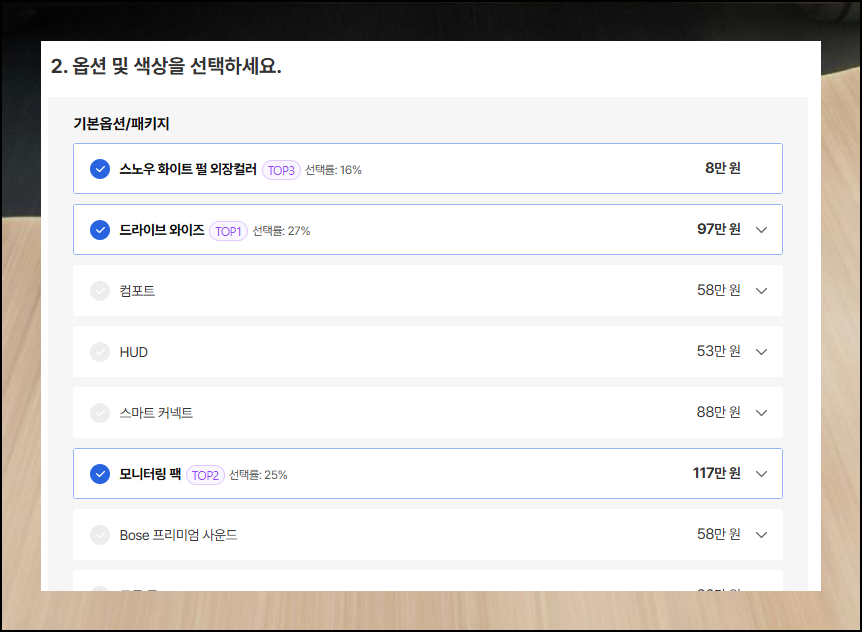 기본 장착품부터 패키지 옵션까지 선택 범위가 넓어요. 각각의 옵션에 대한 설명도 가격표에서 볼 수 있습니다. 옆에 있는 화살표를 클릭하면 돼요.
