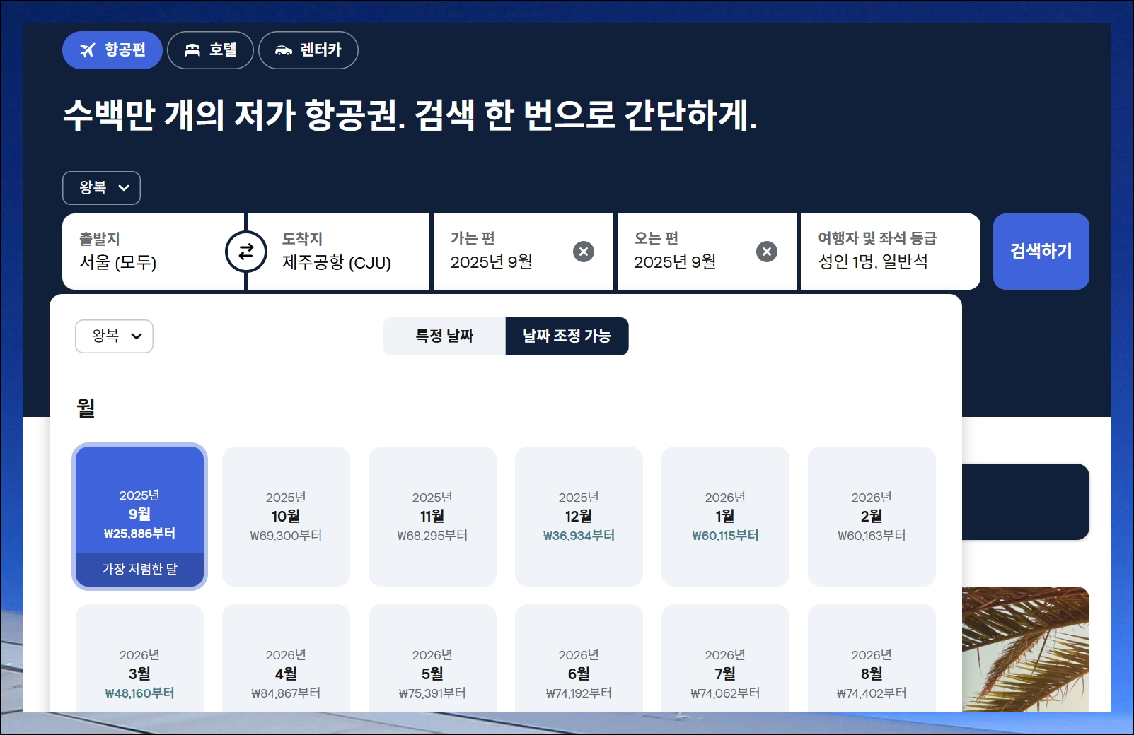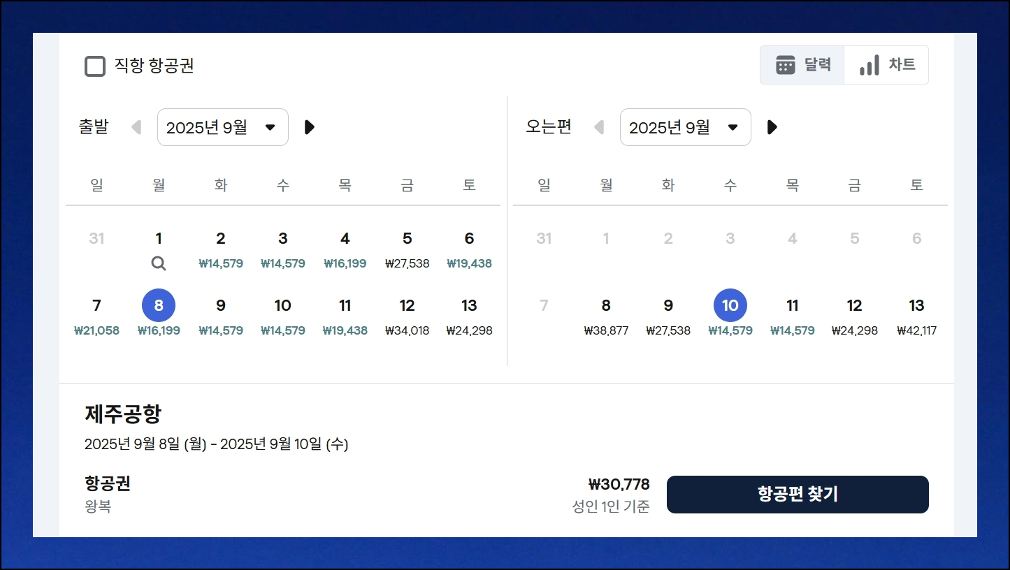 사이트에서 제공하는 달력 모습으로 된 가격 비교 서비스를 적극 활용해보세요. 각 날짜별 최저 요금을 한 화면에서 비교할 수 있어요. 여행 날짜를 조금 유연하게 생각한다면 더 많은 혜택을 누릴 수 있습니다. 제주행도 3만원대 파격 할인을 만날 기회가 있어요.
