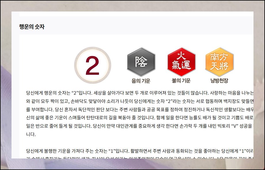 사주풀이 프로그램에서 제공하는 풀이 내용은 A4 용지 8장에서 10장 정도의 풍부한 분량이에요. 그 중에서도 특히 기억해둘 만한 부분은 행운의 숫자와 컬러인데요.