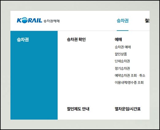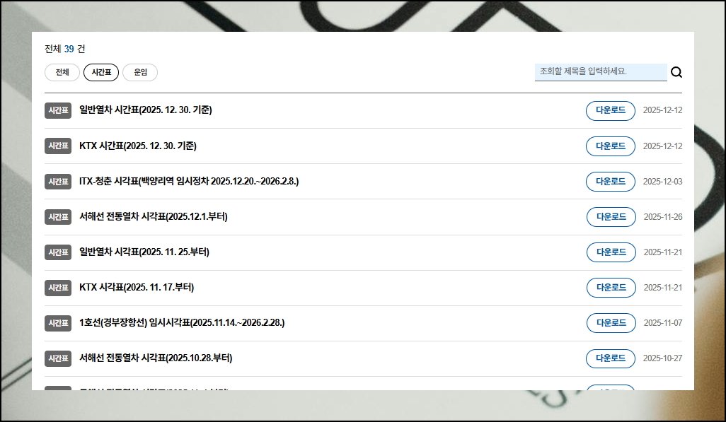 전체 메뉴를 펼치면 승차권 항목 하위에 열차 운임과 시간표 메뉴가 나타나요. 해당 메뉴를 선택해주세요. ITX청춘열차를 포함한 여러 교통수단의 시간표와 요금 정보를 최신 상태로 볼 수 있습니다.