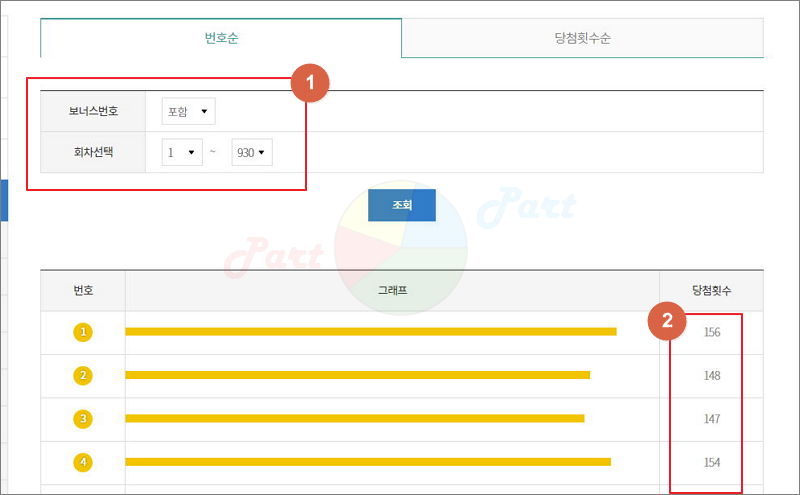 회차의 범위와 보너스 번호 포함 여부를 선택한 후 [조회] 버튼을 클릭해 보세요. 그럼 각 번호가 얼마나 당첨 되었는지 확인할 수 있어요.