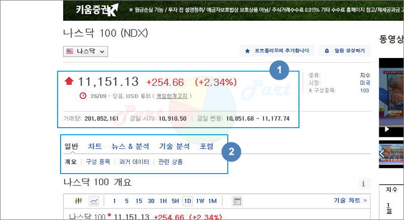 먼저 나스닥 100을 클릭해 보았어요. 여기도 다음과 동일하게 현재가, 전일비, 등락률 확인이 가능한데요. 거기에 더하여 거래량, 금일 시가, 금일 변동도 살펴볼 수 있어요. 이 밖에 차트, 뉴스, 분석 자료, 포럼 등의 서비스도 제공하고 있고요.