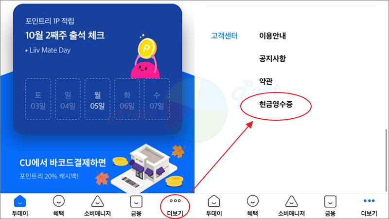 그럼 화면 맨 아래에 고객센터 카테고리에서 현금영수증 서비스를 찾을 수 있어요.