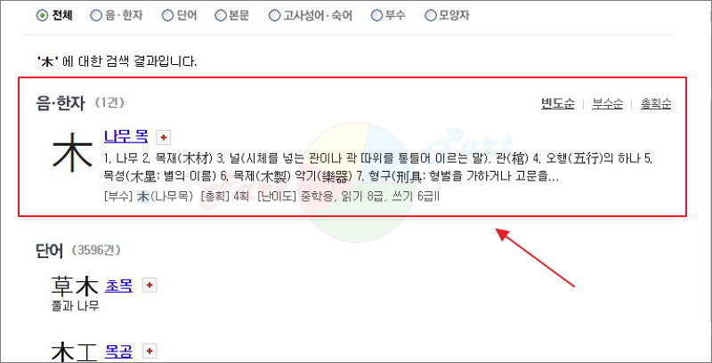 ▲ 검색 결과를 보면 아시겠지만, 단순히 하나의 한자에 대한 것만 나오는 것은 아닙니다. 본문, 고사성어, 부수, 모양자, 단어 등 관련 된 것이 모두 검색 됩니다.