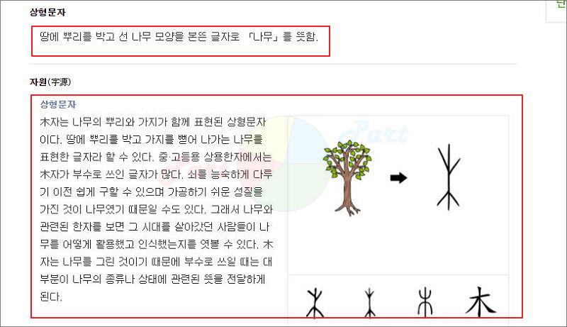▲ 네이버 한자사전을 통해 상형문자나 자원도 알아볼 수 있습니다. "나무 목"의 경우에는 나무의 모양을 본뜬 글자라고 합니다. 이런 식으로 한자가 어떻게 만들었는지 알면 오랜 기간 기억하는 데에 도움이 됩니다.
