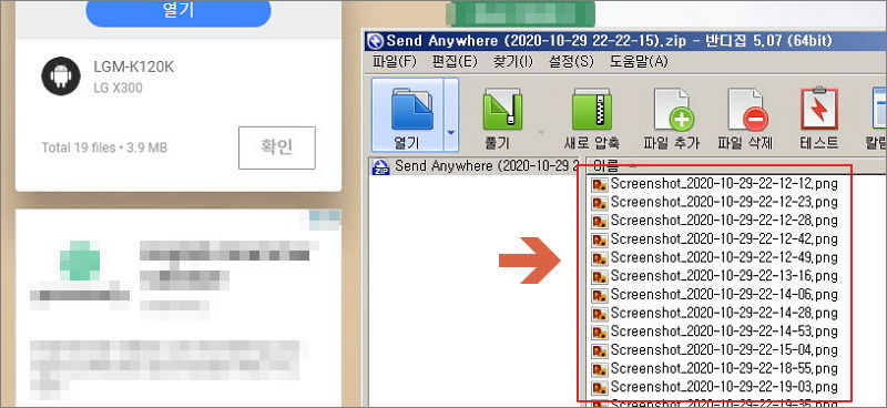 ▼ 압축된 상태로 파일을 하나 전송받게 됩니다. 한 번에 50GB 용량까지 파일 전송이 가능합니다. 여러 명에게 링크로 파일을 공유할 수도 있습니다. 반디집이나 알집과 같은 파일 압축 프로그램을 사용하여 전송 받은 파일의 압축을 풉니다. 그럼 스마트폰에 있었던 모습 그대로 파일을 백업할 수 있습니다.