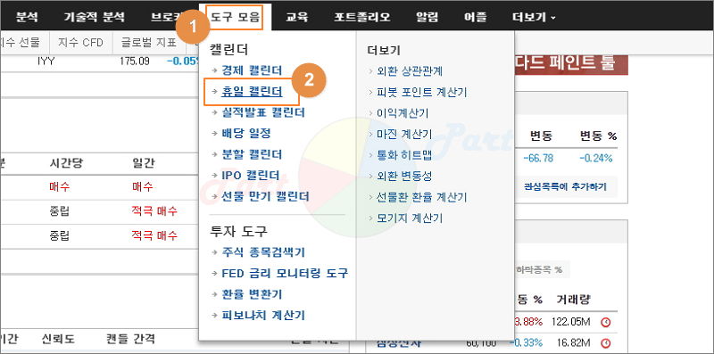 ▼ 요즘에는 미국 증시에 참여하는 투자자가 많습니다. 이런 경우 뉴욕증시가 언제 열리고, 열리지 않는지 알고 있는 것이 좋습니다. 인베스팅에서 "도구 모음"을 클릭하면 "휴일 캘린더" 서비스를 찾을 수 있습니다.