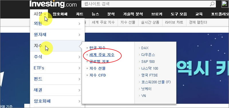 ▼ 일단 가장 먼저 이용해야 하는 것은 미국과 국내 지수를 확인하는 것입니다. 개별 주식시세에 큰 영향을 주는 요인이기 때문입니다. 메뉴에서 "시장"과 "지수"를 차례대로 클릭하면 "세계 주요 지수" 서비스를 찾을 수 있습니다.