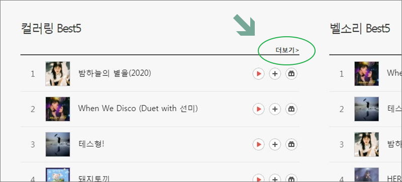 ▼ 새롭게 열린 페이지를 보면 컬러링과 벨소리로 하기에 좋은 노래 Best 5가 나와 있습니다. 5개만 가지고는 조금 부족하다고 생각될 수 있습니다. 이럴 때에는 리스트 상단 우측에 있는 "더보기" 버튼을 클릭하면 됩니다.