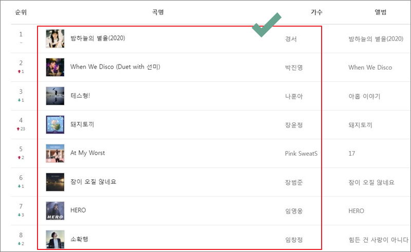 ▼ 현재 기준으로 인기 있는 컬러링 노래를 몇 가지 뽑아 보았습니다. skt 사이트에서 가져온 데이터이기 때문에 나름 신뢰도가 높다고 할 수 있습니다.