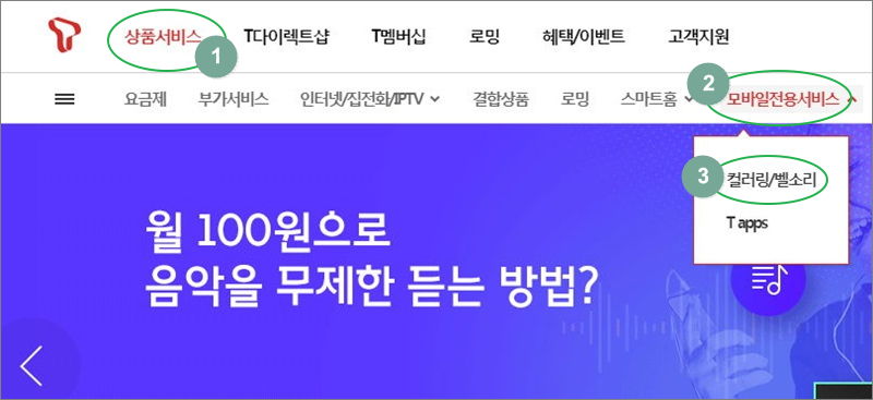 ▼ 티월드 사이트에 접속했습니다. 이곳에서는 여러 가지 컬러링과 벨소리에 들어가는 곡의 순위를 살펴볼 수 있습니다. skt 통신사를 이용하는 경우라면 티월드에서 컬러링과 벨소리 설정도 가능합니다. 그럼 인기 노래 순위를 보기 위해 메뉴에서 "상품서비스"와 "모바일전용서비스"를 클릭합니다. 그럼 "컬러링/벨소리" 서비스를 찾을 수 있습니다.
