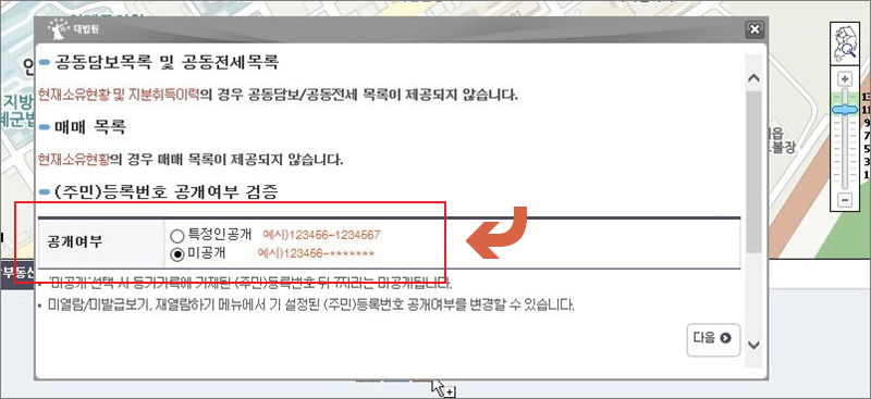 ▼ 인터넷 발급을 통해 받을 등기부등본에 주민번호 표시를 할지 선택해야 합니다. 제출처의 기준에 맞게 선택하면 됩니다.