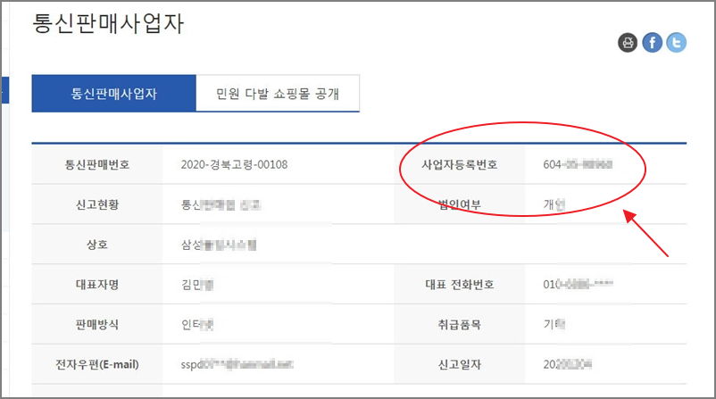 그럼 표를 통해 통신판매번호, 사업자등록번호, 신고현황, 상호, 대표자명, 취급품목, 법인여부 등 여러 가지 정보를 얻을 수 있습니다.