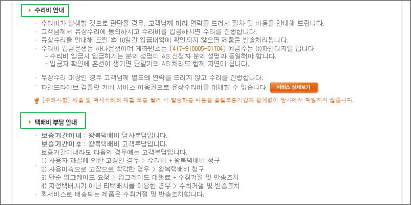 고객센터 페이지에는 수리비에 대한 내용도 언급되고 있는데요. 기기의 상태에 따라 수리비 발생 여부가 달라져요. 수리비가 발생될 것으로 판단이 되면 파인드라이브 고객센터로부터 수리 절차와 비용을 안내 받을 수 있어요. 유상수리를 해야 하는 경우 수리비 입금이 되어야 수리가 진행될 수 있어요. 택배 비용의 경우는 보증기간에 따라 파인드라이브에서 부담이 되는지 고객부담이 되는지 달라져요. 보증기간 내라도 사용자 과실이라면 고객 부담이 될 수 있으니 참고해 주세요.