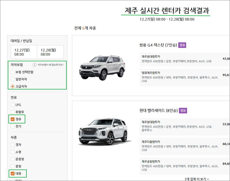 제주도에서 카니발을 모는 경우에는 티몬 사이트에서 이용할 수 있는 "제주 실시간 렌터카 검색" 기능을 사용해 보세요. 카니발 외에 많은 차량을 이용하고 싶을 때 쉽게 렌트비용을 비교할 수 있어요. 대여일과 반납일을 지정할 수 있기 때문에 1일에서부터 그 이상의 기간을 비교할 수도 있죠. 카니발을 찾아보려면 좌측에 있는 메뉴에서 연료를 경유, 차종을 경유로 지정하면 돼요.