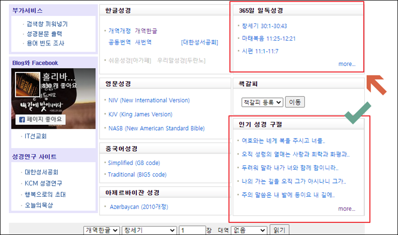홀리넷 홈페이지에 접속했습니다. 앞서 언급한 바와 같이 여러 가지 버전 및 언어로 된 성경이 보이는데요. 클릭하면 아무 조건 없이 무료로 성경을 읽을 수 있습니다. 사이트 우측 하단을 보면 인기 성경구절도 있는데요. 해당 서비스를 통해 한글로 된 문장을 찾는 것은 물론이고, 영어로 된 성경구절 찾기도 가능합니다.