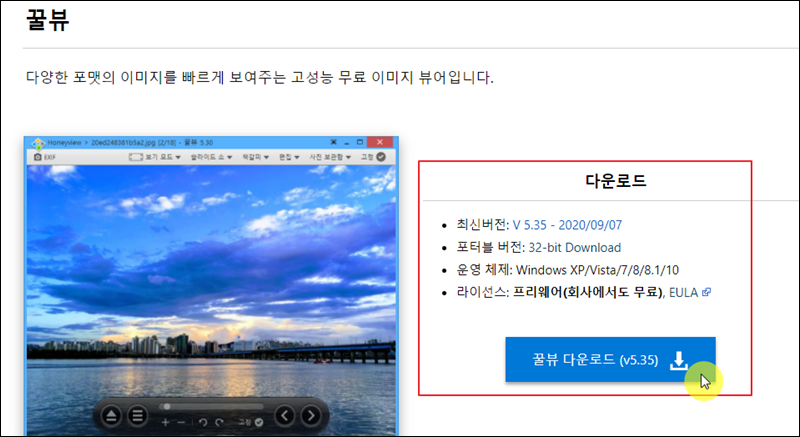 참고로 꿀뷰는 무료로 다운 받아 사용할 수 있는 프로그램입니다. 윈도우에서 사용할 수 있고, 회사에서 사용해도 괜찮습니다. 원래 jpg, png 등의 이미지 파일을 보여주는 프로그램인데요. 이미지 파일 열람 기능 외에도 꽤 많은 기능을 갖추고 있습니다.