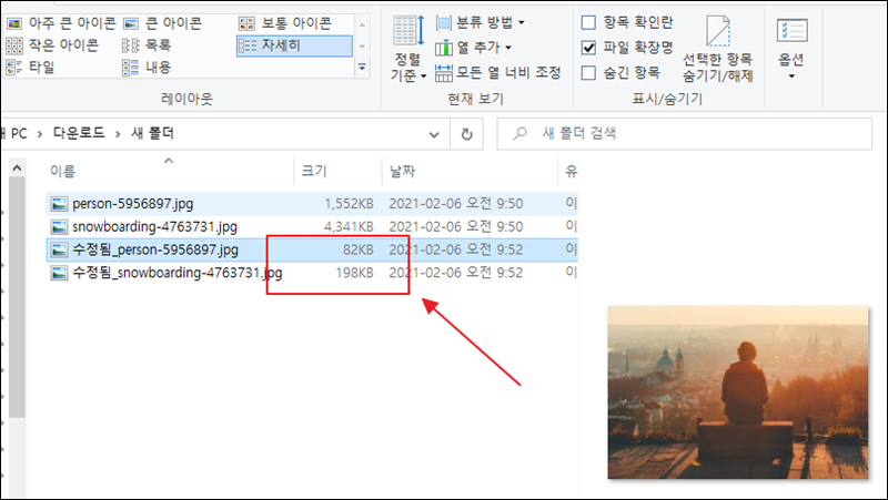 앞서 선택한 2개의 jpg 파일의 용량을 확인해 보겠습니다. 변환된 결과값을 보아하니 첫 번째 파일은 1552kb에서 82kb으로 줄어들었고, 두 번째 파일은 4341kb에서 198kb로 줄었습니다. 꽤 많은 용량에 대한 줄이기를 성공하였음을 확인할 수 있습니다.