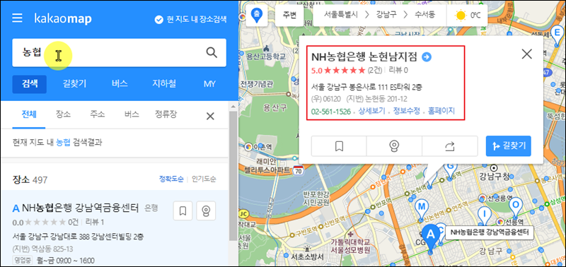 카카오맵 사이트에 접속하면 좌측 상단에 검색창이 보일 거에요. 여기에 "농협" 또는 "농협은행"을 입력한 후 엔터키를 눌러보세요. 그럼 우측에 있는 지도 화면에서 농협은행 지점 여러 곳이 표시될 거에요. 앞서 알려드린 당첨금 수령방법을 숙지한 후 가까운 지점을 찾아서 방문하면 돼요.