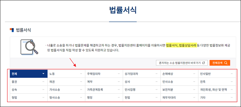 법률 서식 관련 페이지가 열렸어요. 노동, 가사소송, 형사소송, 행정, 헌법, 민사소송, 손해배상 등 여러 가지 부분에 있어서 서식을 찾아볼 수 있는 페이지에요.