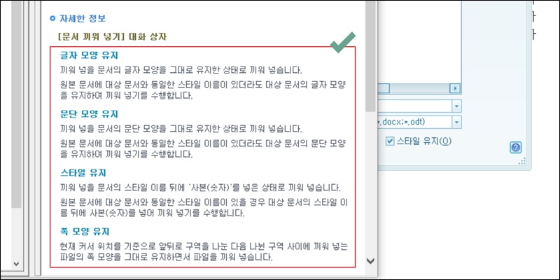 앞서 언급한 글자 모양에 대한 유지, 문단 모양에 대한 유지, 스타일 및 쪽 모양에 대한 유지가 무엇인지 잘 모를 수 있는데요. 한글파일을 추가할 때 물음표 버튼을 클릭하면 이에 대해 자세히 알아볼 수 있어요. 참고해 주세요.