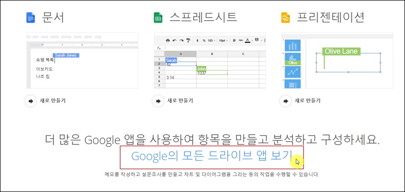 홈페이지 메인화면이에요. 문서, 스프레드시트, 프리젠테이션 문서를 다룰 수 있다고 하는데요. 해당 문서 포멧은 다음에 다루기로 하고, 메인화면 중앙에 있는 구글의 모든 드라이브 앱 보기 버튼을 클릭해 주세요.