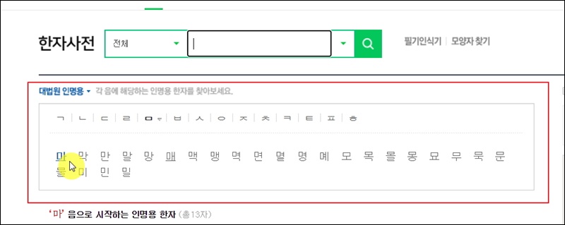 한자사전 사이트에서 화면을 내려보면 "대법원 인명용" 서비스가 있는데요. 이를 통해서도 인명용 한자를 모두 찾아볼 수 있어요. 이전단계와는 반대의 방식으로 알아보는 것이죠.
