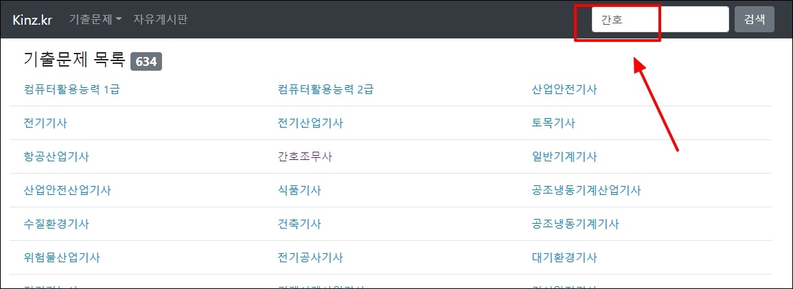 kinz 사이트에 접속했습니다. 634개의 자격증 시험 목록이 나타났습니다. 여기에서 간호조무사를 찾으면 되는데, 너무 많아서 쉽게 찾지 못할 수 있습니다. 이런 경우에는 우측 상단에 있는 검색 기능을 사용하면 됩니다.