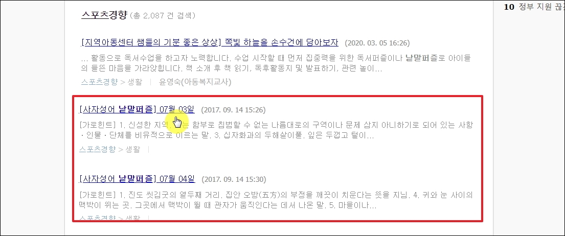 ▼검색 결과를 보면 사자성어 낱말퍼즐을 찾을 수 있습니다. 좀 옛날 자료이긴 하지만, 사자성어의 경우 새롭게 생겨난 것이 없으니 지금 풀어도 상관 없습니다.
