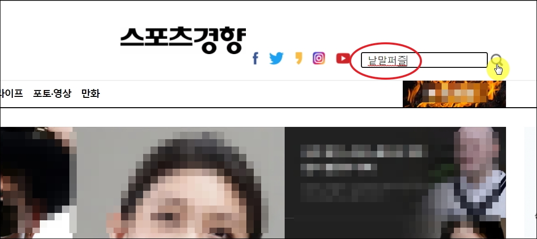 ▼스포츠경향 홈페이지에 접속했습니다. 우측 상단에 보면 검색창이 있습니다. 여기에 "낱말 퍼즐"을 입력한 후 검색 아이콘을 클릭합니다.