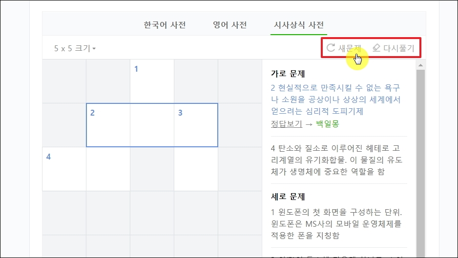 ▼풀고 있는 문제가 마음에 들지 않거나 다른 문제를 풀어보고 싶을 때에는 [새문제] 버튼을 눌러봅니다. 그럼 다른 가로세로 퀴즈 문제를 만나볼 수 있습니다. 계속 [새문제] 버튼을 누르면 새로운 퍼즐이 나타나기 때문에 많은 양의 퀴즈를 풀 수 있습니다.
