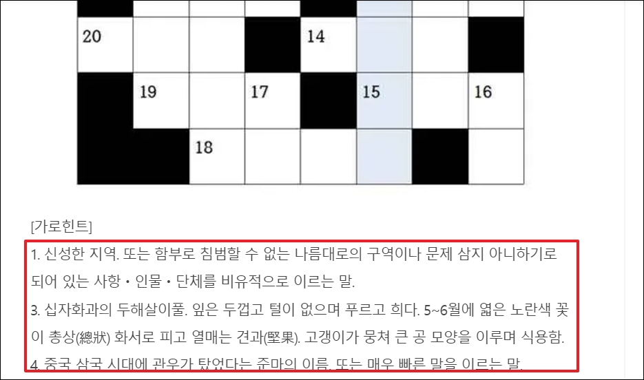 ▼과거 신문에서 뒷 페이지에 있던 가로세로 낱말퍼즐과 비슷한 느낌으로 출제가 되어 있는 것을 알 수 있습니다. 하단에 있는 문제를 보고, 하나씩 맞추어 나가보시길 바랍니다.