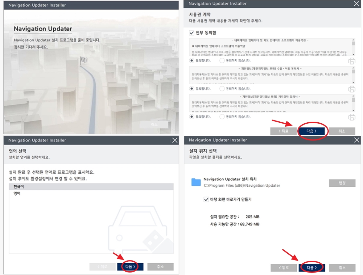 ▼다운로드 받은 설치 파일을 실행하여 컴퓨터에 설치를 진행합니다. 현대자동차 내비게이션 업데이터 프로그램을 설치하는 방법은 간단합니다. 안내에 따라 [다음] 버튼만 눌러주면 됩니다.