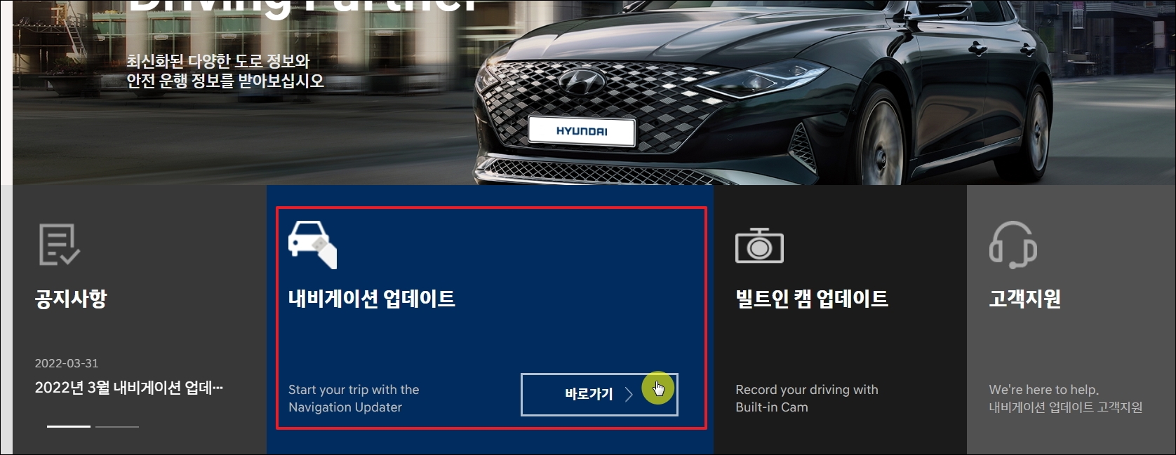 ▼사이트에 접속하면 공지사항, 내비게이션 업데이트, 빌트인 캠 업그레이드, 고객지원 이렇게 4가지 메뉴가 나타납니다. 여기에서 두 번째 메뉴를 선택합니다.
