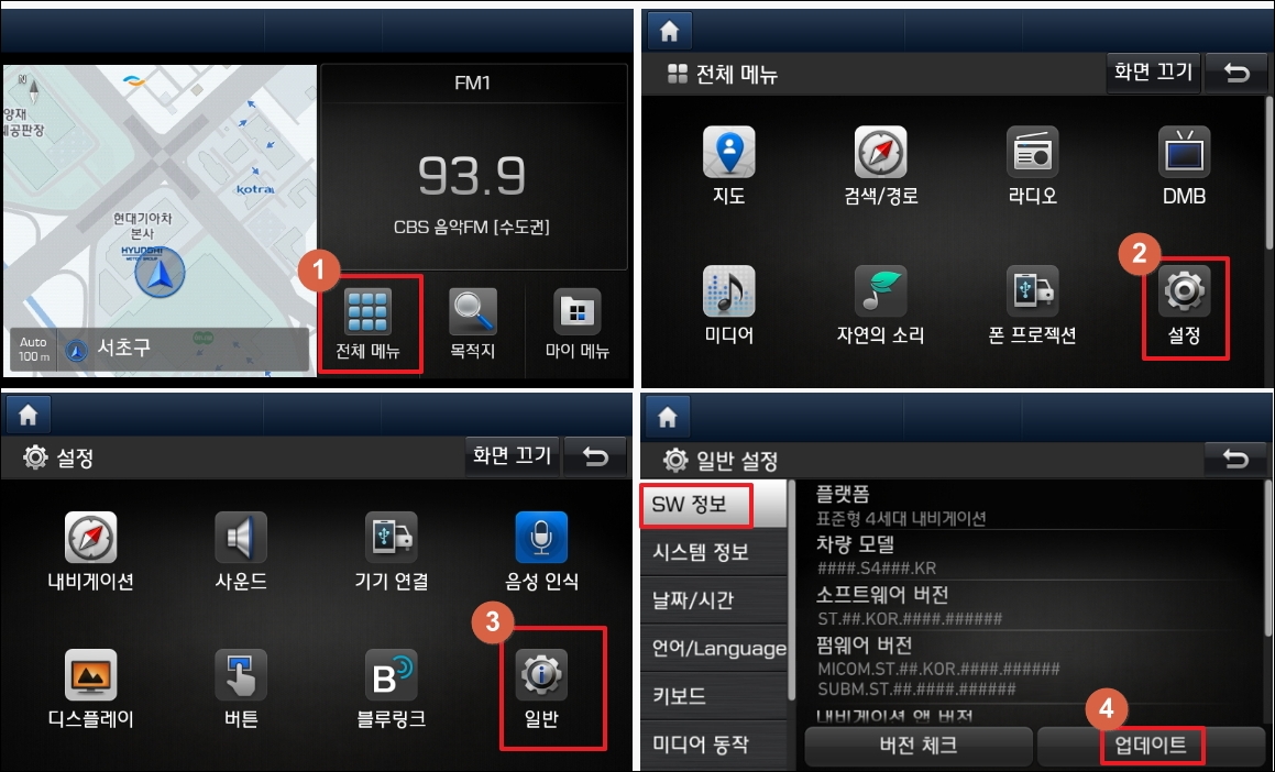 ▼이용하는 현대자동차 모델에 따라 내비게이션 업그레이 화면이 다를 수 있습니다. 다음과 같은 화면이 나오는 경우에는 전체 메뉴, 설정, 일반, SW 정보, 업데이트 버튼을 순서대로 터치하면 됩니다.