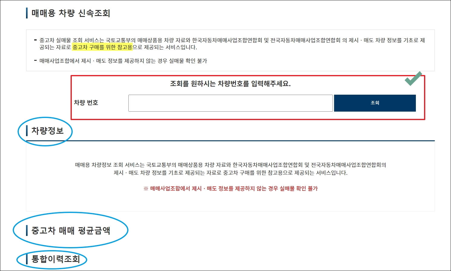 ▼여기서는 매매용 차량 신속조회 서비스도 제공하고 있습니다. 중고차 구매를 할 때 참고하면 좋은 정보를 얻을 수 있습니다. 조회하고자 하는 자동차 번호를 입력한 후 [조회] 버튼을 클릭하면 바로 확인이 가능합니다. 차량정보, 중고차 매매 평균금액, 통합이력을 확인할 수 있습니다.