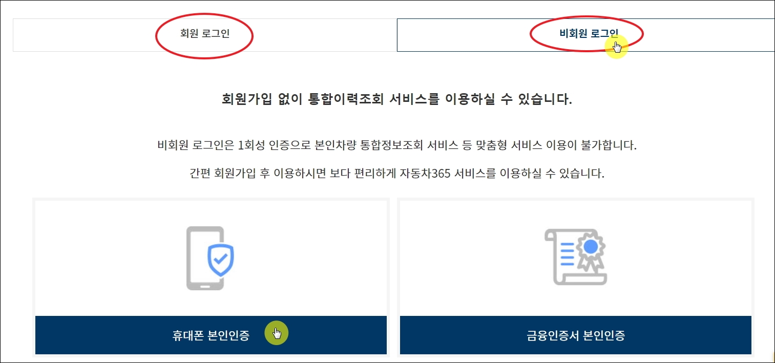 ▼차량 조회 서비스를 이용하기 위해서는 로그인을 해야 합니다. 자동차365 사이트를 자주 이용할 예정이라면 사이트에 회원가입을 한 후 [회원 로그인]을 진행하면 됩니다. 어쩌다 한 번 이용하는 일회성 접속이라면 [비회원 로그인]으로 진행하는 것이 편리합니다. 회원가입 없이 휴대폰 본인인증을 통해 로그인을 할 수 있기 때문입니다.