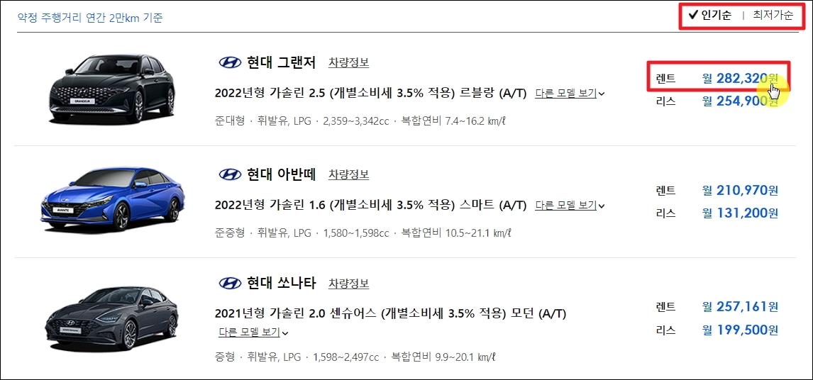 ▼결과가 나왔습니다. 제가 선택한 조건에 맞는 차량이 나타났는데요. 현대 그랜저의 경우 장기로 이용하는 경우 월 282,320원 정도 납부해야 한다고 합니다. 약적 주행거리 연간 2만km 기준이오니 이점 참고해 주시길 바랍니다. 장기렌트 리스트는 인기순 또는 최저가순으로 정렬이 가능합니다. 저렴한 상품을 원한다면 [최저가순]을 선택해 주세요.