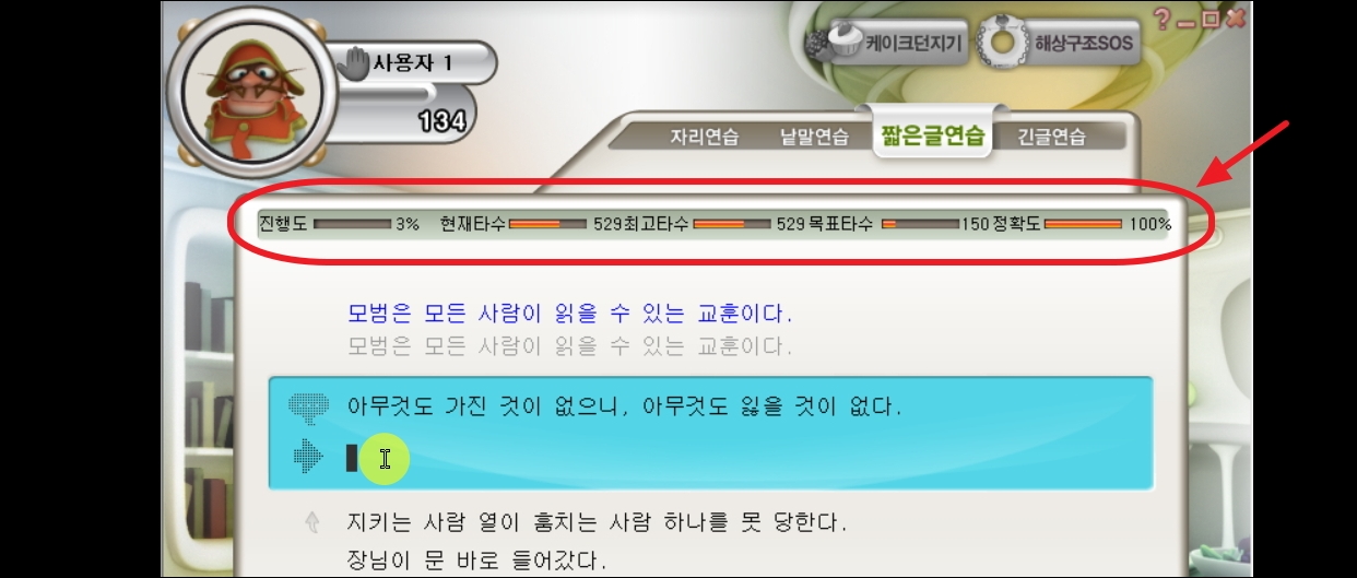 ▼개인적으로 짧은 글을 가지고 타자연습을 하는 것을 좋아하는데요. 이때부터 타자속도를 향상 시키는 데에 집중하면 됩니다. 타수 지표가 추가되었으니 해당 지표를 참고하면서 연습해 보세요.