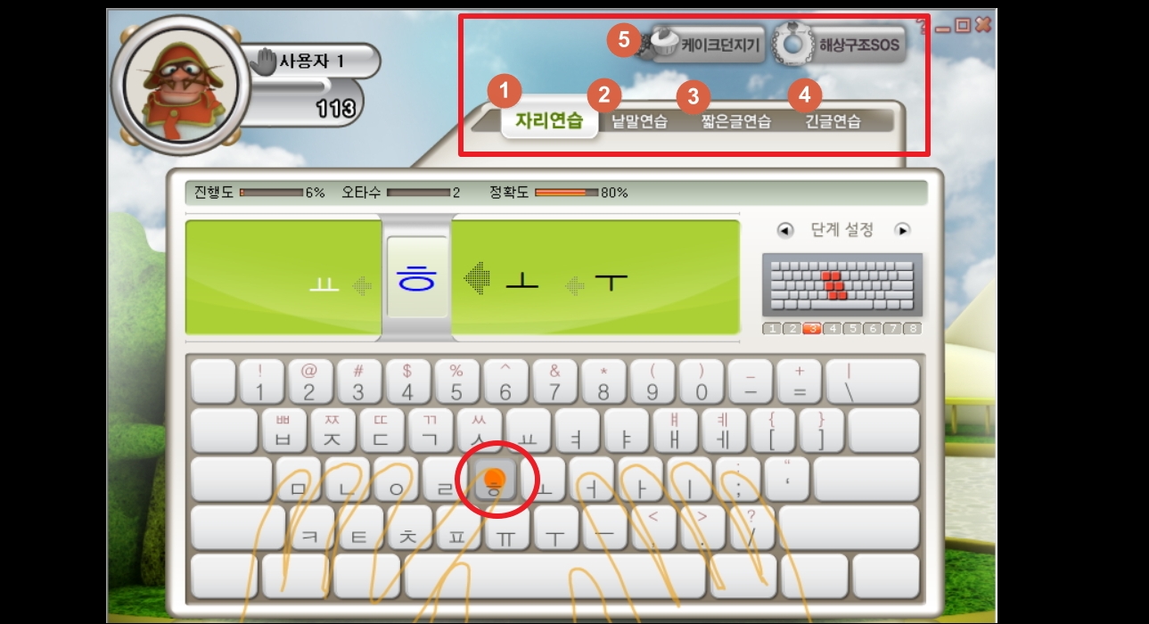 ▼여기서 타자연습을 할 수 있는 과정은 크게 다섯 가지로 분류가 됩니다. 자리, 낱말, 짧은글, 긴글에 대한 연습 과정과 게임 2가지가 제공되고 있죠. 다음은 자리를 익히는 연습을 진행하는 화면입니다. 손가락과 키보드 이미지를 통해 어느 손가락으로 어떤 버튼 클릭 해야 하는지 쉽게 파악할 수 있어요.