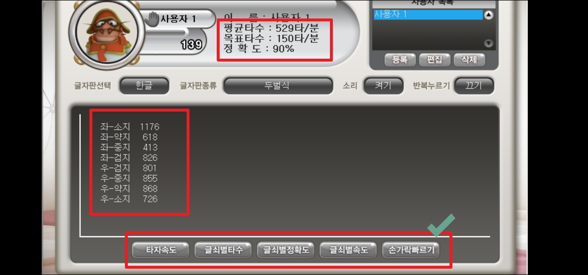 ▼프로그램 설치 방식으로 이용하는 한컴 타자 연습은 다음과 같이 뛰어난 통계 서비스를 제공합니다. 어디서나 볼 수 있는 평균타수, 목표타수, 정확도는 기본이고, 다른 곳에서 찾아보기 힘든 글쇠별 타수, 글쇠별 정확도, 글쇠별 속도, 손가락 빠르기에 대한 통계를 확인할 수 있습니다.