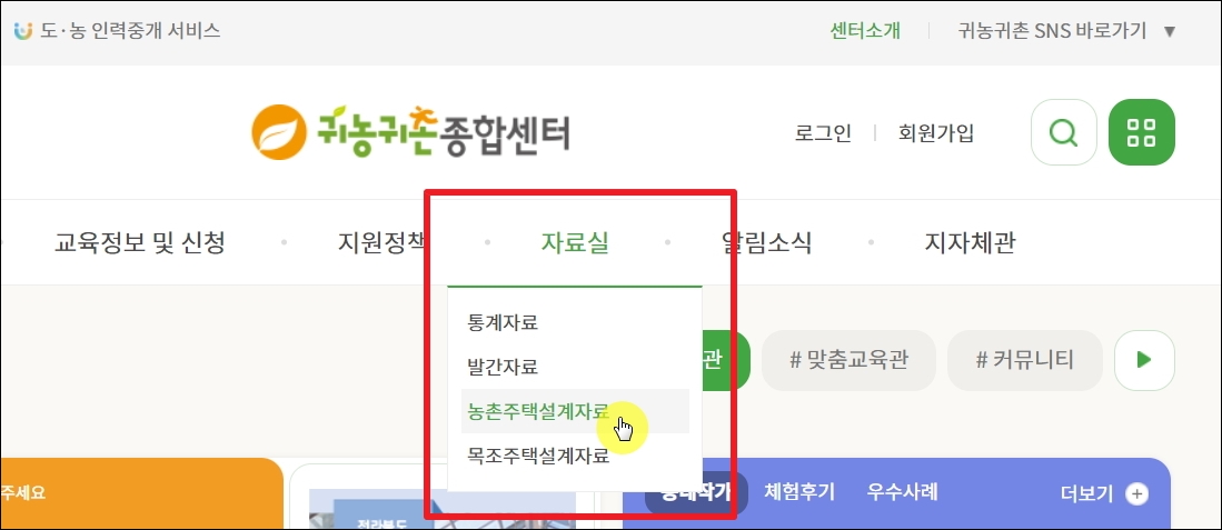 ▼귀농귀촌종합센터 홈페이지에 접속했습니다. 메뉴에서 보면 교육 정보나 지원정책 같은 귀농귀촌 하시는 분들에게 유용한 정보가 많네요. 농가주택 설계도 자료는 메뉴에서 자료실을 클릭해 보세요. 그 다음 세 번째 위치한 농촌 주택 설계 자료를 클릭하면 됩니다.