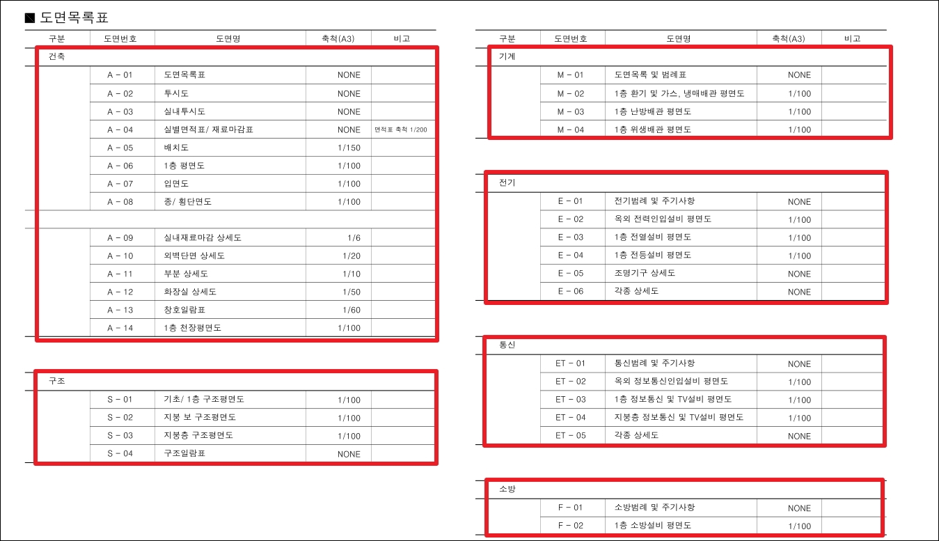 ▼우리가 이용할 표준 설계 자료는 다음과 같이 많은 2면으로 구성되어 있습니다. 농가주택을 지을 때 많은 도움을 받을 수 있죠. 건축, 기계, 구조, 전기, 통신, 소방 이렇게 6가지 분류로 나눌 수 있습니다.