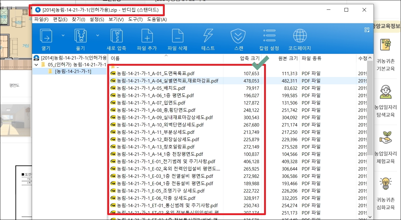 ▼다운받은 파일은 압축이 되어 있습니다. 압축을 해제한 위해서는 국내 소프트웨어인 알집과 반디집을 이용하시면 됩니다. 압축된 파일 안에는 PDF로 된 열어두면 파일이 있는데요. 이것은 귀농귀촌 사이트에서 제공하는 PDF 뷰어 이용하면 됩니다.
