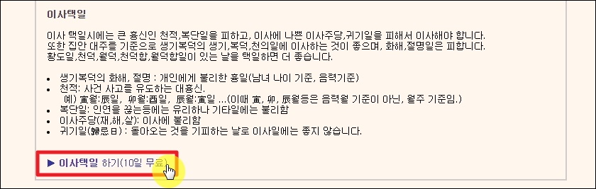 ▼안내 문구 페이지에서 맨 아랫쪽을 보면 "이사택일 하기 (10일 무료)" 버튼이 있습니다. 해당 버튼을 클릭하면 나를 기준으로 해석한 결과를 볼 수 있습니다. 사용법은 간단합니다.