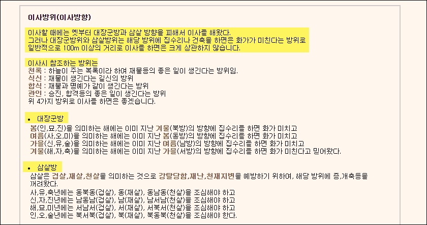 ▼일단 이사방향에 대한 기본적인 정보를 알고 계시는 것이 좋습니다. 옛부터 우리 조상님들은 이사를 진행할 때 대장군방과 삼살 방위를 피했다고 합니다. 좋은 기운을 가져다 주는 방위으로는 천록, 식신, 합식, 관인 이렇게 4가지가 있는데요. 천록과 식신은 재물에 좋은 영향을 주고, 합식은 재물과 명예, 관인은 승진이나 합격에 관련하여 좋은 일을 가져다 주는 방위라고 합니다. 반대로 대장군방과 삼살방으로 이사를 가면 피해를 볼 수 있죠.