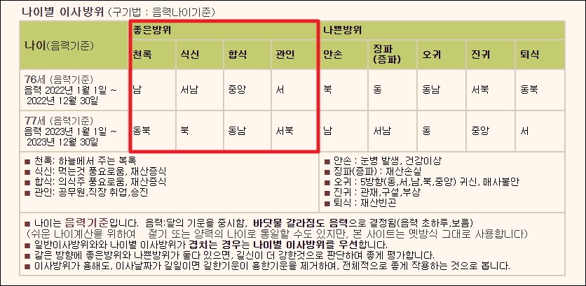 ▼새로운 페이지가 열리면서 다양한 풀이가 나타납니다. 보는법은 해석마다 하단에 기재가 되어 있습니다. 가장 먼저 일반 이사방위와 삼재에 대한 내용인데요. 22년과 23년에 피해야 하는 방향을 확인할 수 있습니다.