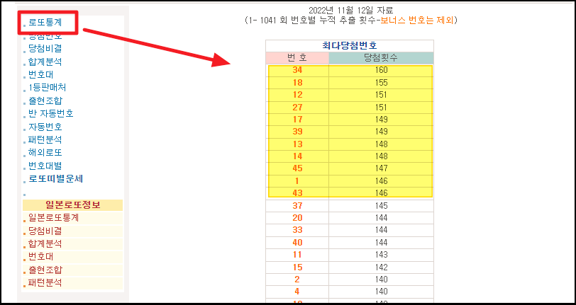▼ 역대 당첨번호 중에서 가장 많이 나온 숫자를 알고 싶을 때에는 메뉴에 있는 [로또 통계]를 클릭해 보세요. 1041회까지 누적 추출된 것을 바탕으로 34번이 160회로 가장 많고, 그 다음이 18번이네요.